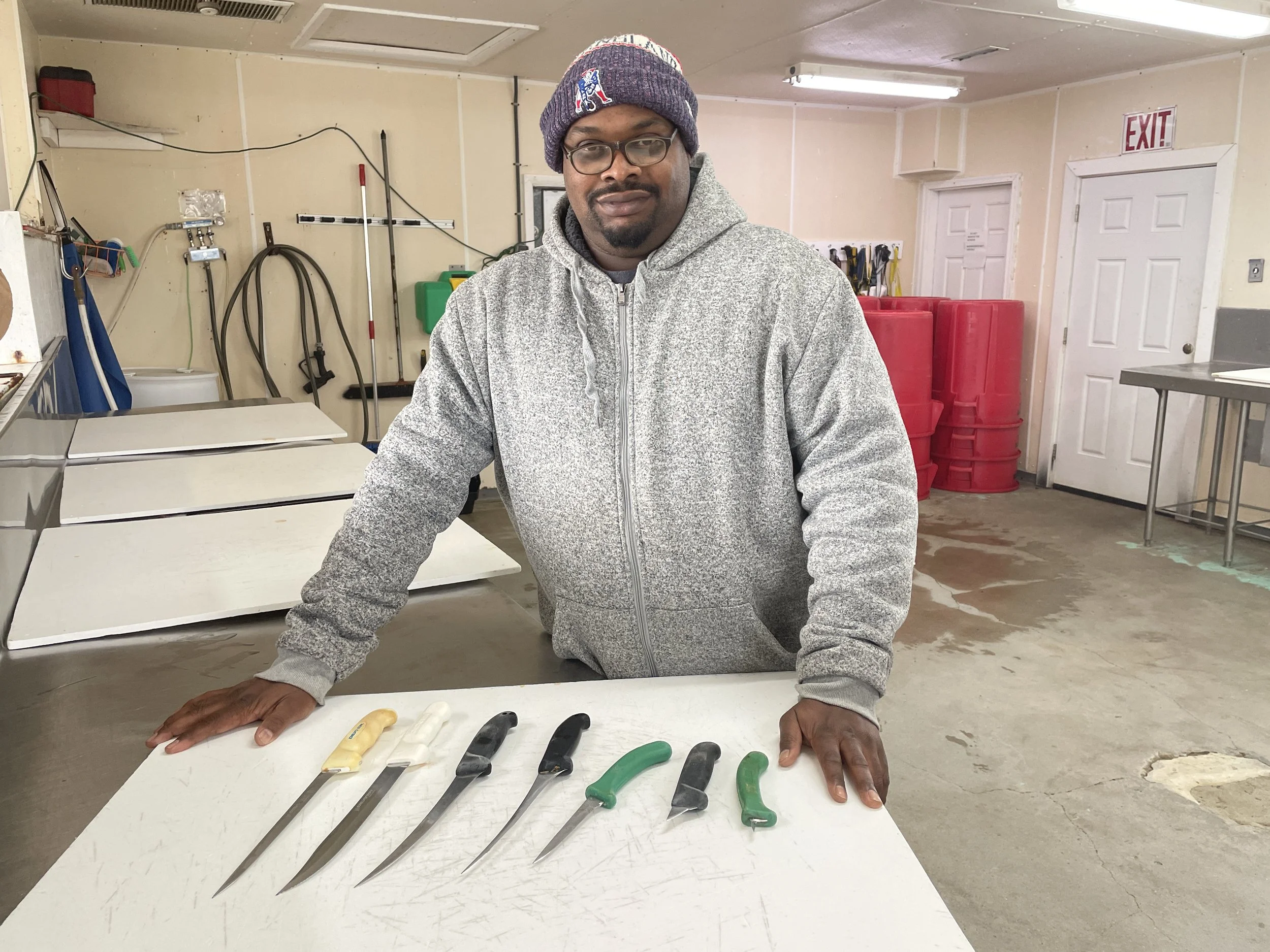 “I mean, think about it. You catch an 800-pound fish, how are you going to clean that yourself?” Reeves said, standing over his own working collection of seven knives. Like all the fish cutters, Reeves customized each one to perform specific tasks.